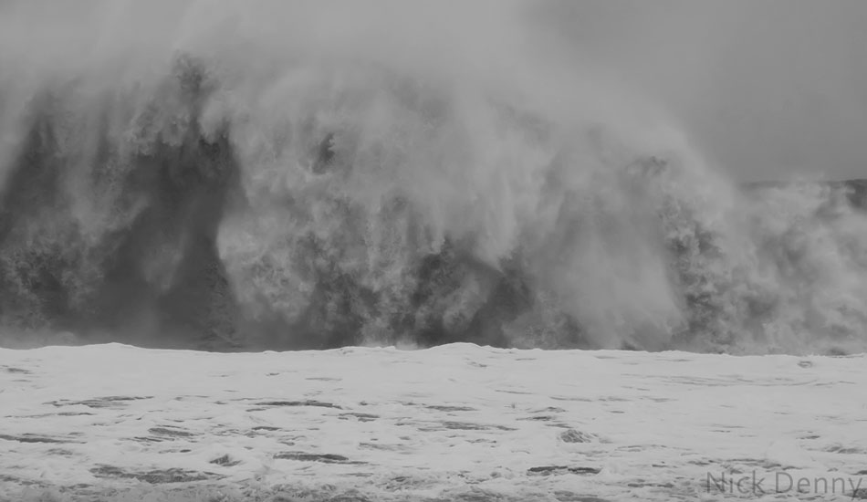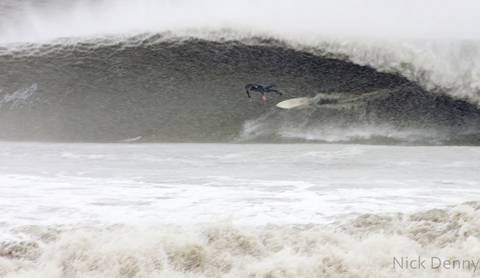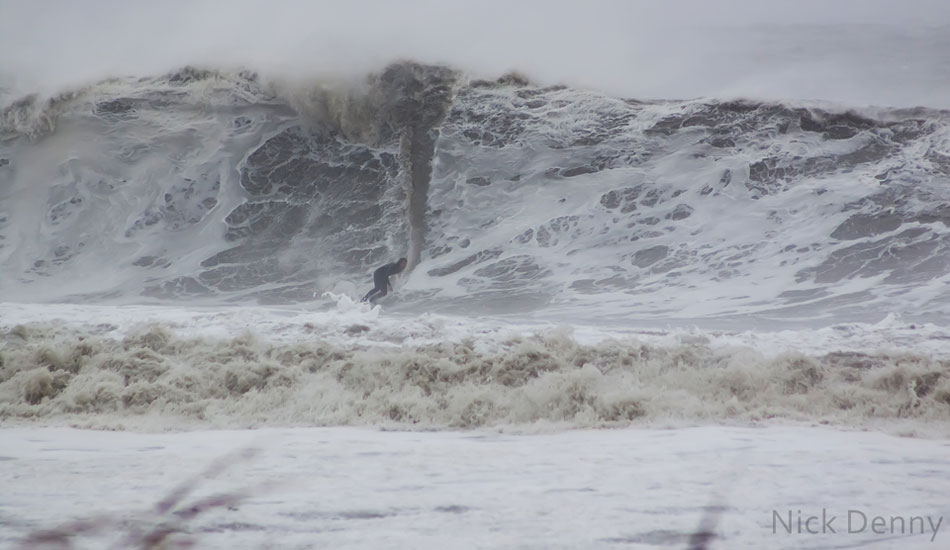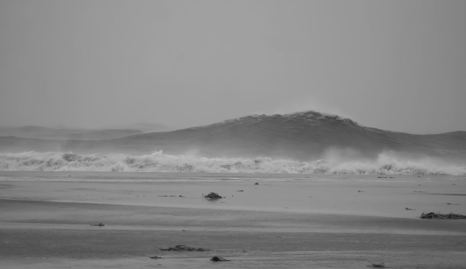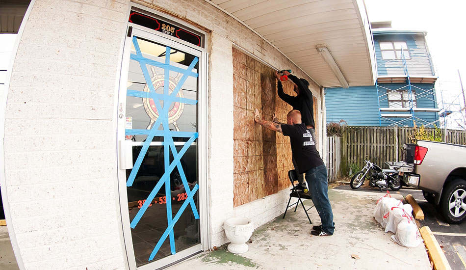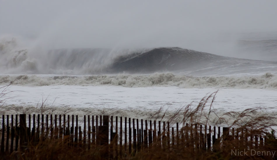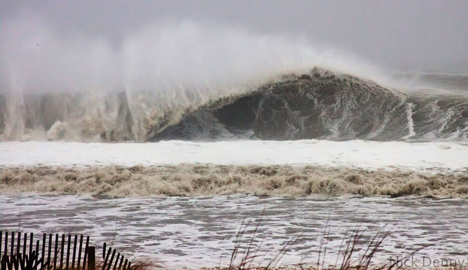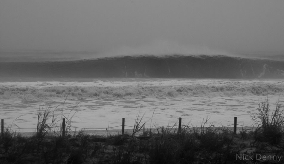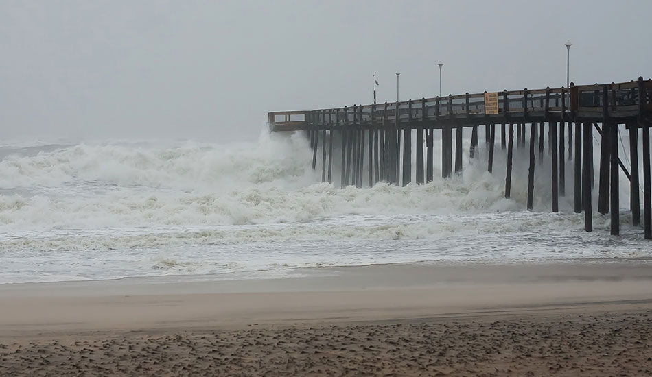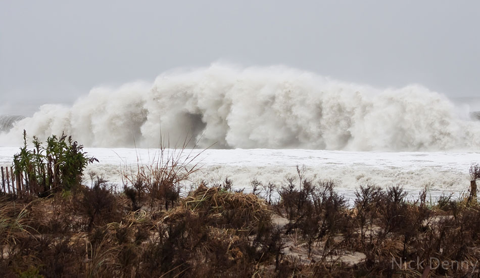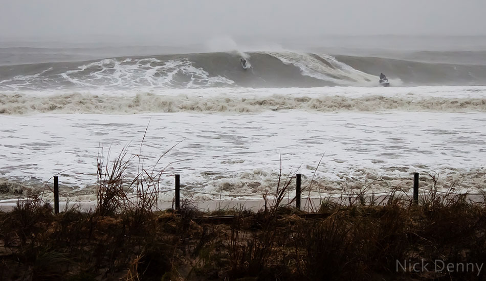 Conditions were terrible two days before the storm even hit. Friday night we started to see a little wave, and by Saturday it was really filling in with some solid overhead waves. Sunday wasn’t even rideable. The sea was raging. I shot a few pictures around town, trying to capture a wave, but came up with nothing. Evacuations began flooding in on Monday and all access to the downtown Ocean City was restricted. I had to park in West Ocean City, sneak past the road closure and walk over the bridge into town. While I was walking, a cop was just leaving and as he saw me, slammed on his brakes and pulled a U-turn. I ran down the sidewalk until I hit waist deep water. We exchanged a long glance before he decided to leave me to try my luck with the raging ocean. I made my way down to the pier and saw solid 15-foot waves rolling in, hitting the top of the pier, causing serious damage. An hour later Raven Lundy called to tell me they were going to surf. I got into town an hour before they stopped letting people into the city and linked up with Colin Herlihy, Todd Elder and Raven. They tried getting the ski in for over an hour when the National Guard showed up. We hid under carports and waited another 30 minutes when I got a text saying, “They are gone, we are going for it.” Twenty minutes later, Todd and Raven went out on the ski. Todd surfed first, followed by Raven, and then Colin. They all got a handful of waves, Raven scoring the biggest one. Conditions started to get really bad and rumor had it the only way out was flooding so I had to go home to my dogs. It was kind of scary shooting those guys. I was convinced if something happened and the ski was taken out that things could go sour really quick. The current was ripping and sucking them out so fast. Raven had a serious hold down that was pretty scary to watch, knowing all the while that I couldn’t do anything to help him. All three of them put on a hell of a show, though. As far as I’m concerned, they made history that day. No doubt the biggest wave ever ridden in Maryland.