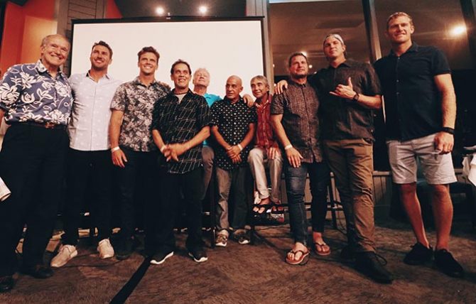 Left to right: Fred Hemmings, Joel Parkinson, Julian Wilson, Derek Ho, Randy Rarick, Michael Ho, Gerry Lopez, Mark Occhilupo, Jamie O’Brien, Bede Durbidge. Photo: The Stoke Life
