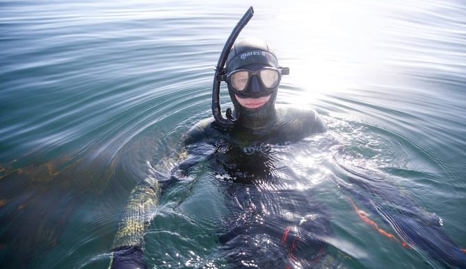 Spearfishing is an uncomfortable sport from the get-go. The 7-millimeter-thick dive suits require lubricant to get into. I douse the inside of my suit with some “seaweed sludge” (a mixture of water and pulverized kelp) and slither into the neoprene. Equipped with a knife, weight-belt, stringer, mask, snorkel, fins, and gun, I wade into the water and kick out through the choppy waves.
