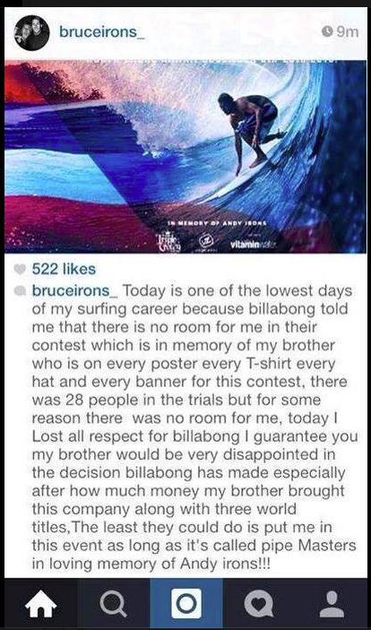 Hailee Wade entered Bruce into eight events on the ‘QS this year, the first of which is the 6-star Burton Auto Pro, which starts this coming Monday in Australia. Of course, the idea of a renewed Bruce donning a jersey again and making a run for the ‘CT has been floating around for some time now. Back in December, it came to light that Billabong wasn’t giving him a spot in the Pipe Invitational, which seemed to most to be a bit outrageous. It’s a contest held in memory of his brother, so who better to keep the memory alive in the water than blood? Bruce was pissed, and let the world know exactly how he felt about it on Instagram… at least for a few minutes. The post was quickly deleted, but not before anyone interested took a screenshot: