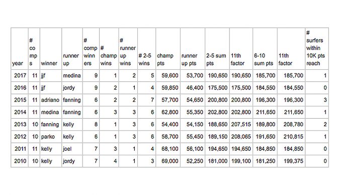 In order to answer that, I decided to put hunches, emotional interpretations and admiration aside so the numbers could tell the story. Taking a look at figures from 2010-2017, I wanted to see what was unique about JJF’s title campaigns when compared to the championships of other surfers in the same era. Sure, we could look back further, but with the new points system taking effect in 2010, it’d be like comparing apples to oranges in this context. Another apples to oranges hiccup I found is that some tours consisted of 10 stops while other years featured an 11-contest campaign. Nonetheless, the numbers can still tell us a story of each Championship Tour winner.