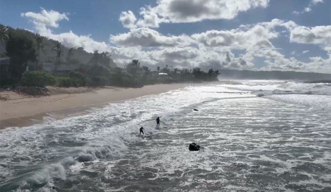 Of course, “surf Pipeline” is a bit of a stretch. Instead, they messed around in Pipeline’s very famous backwash, and although it probably isn’t quite as much fun as a Pipe tube, it sure does beat not surfing.