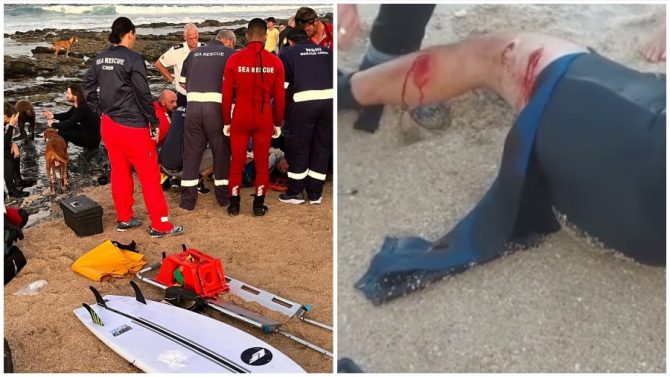 A bystander “raised the alarm,” then obtained access to the shark bite kit the NSRI maintains on the beach. When paramedics arrived, they found good samaritan caretakers applying trauma pads to the man’s wounds. The man received ambulance transport from the scene to a hospital for further care.