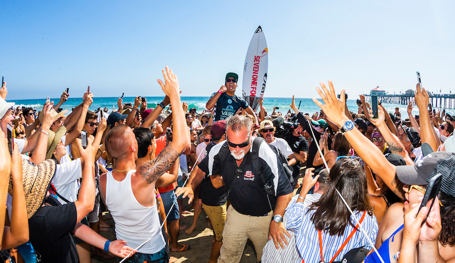 After his victory, Igarashi, who recently swapped country affiliations to represent Japan on the CT, was chaired up the beach backed by a surfboard adorned with the words “seven one four” – the area code in Huntington Beach.