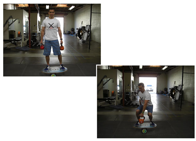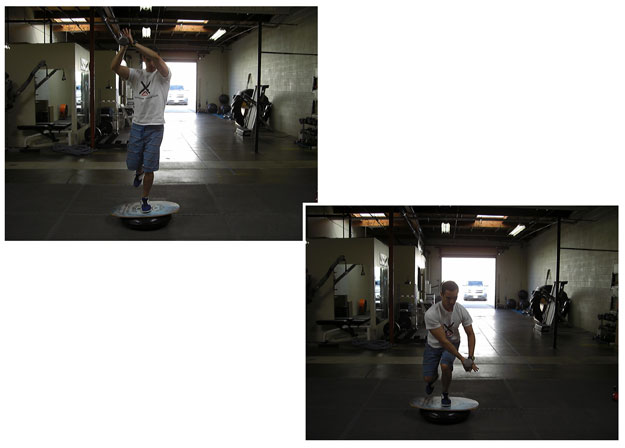 *This hits all the main topics. The Indo board is an unsteady surface so stressing balance and proprioception while on a single leg targets stability and strength in the lower body. The chopping motion fires the transverse abdominis–a main stabilizer in rotation.