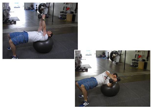 Now, while laying on the ball, extend both arms up, holding on to the weight. Rotate in a slow and controlled manner all the way onto one shoulder by turning at the hips. Return to starting position and repeat in the other direction.