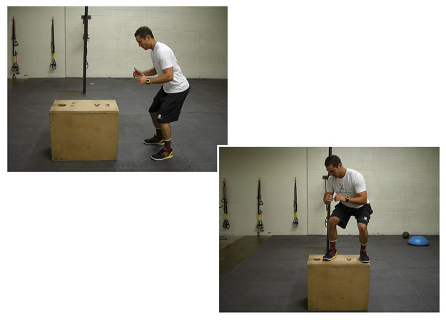 Start facing the box with good posture. Go into a squat, flexing the ankles, knees and hips while keeping the back straight and chest up.
