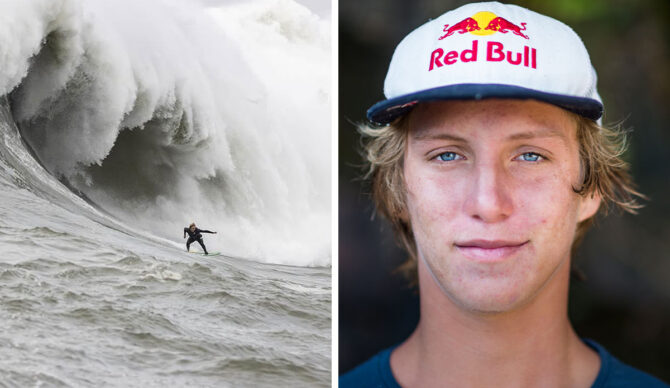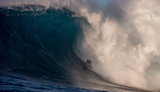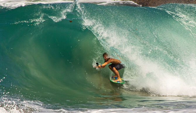 Lucas Fink has ridden many of the world’s premier big wave spots on a skimboard. Pictured here at Jaws.