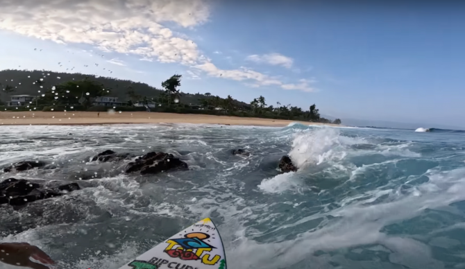 The POV footage gets hypnotic at times. It’s not really the slow motion or the small glassy tubes that do it, it’s the shift from viewing it all coming out of a barrel and then watching Ho immediately kick out and dive under the surface. There, you really get a feel for how packed the North Shore’s reefs are, even at a small wave like this one.