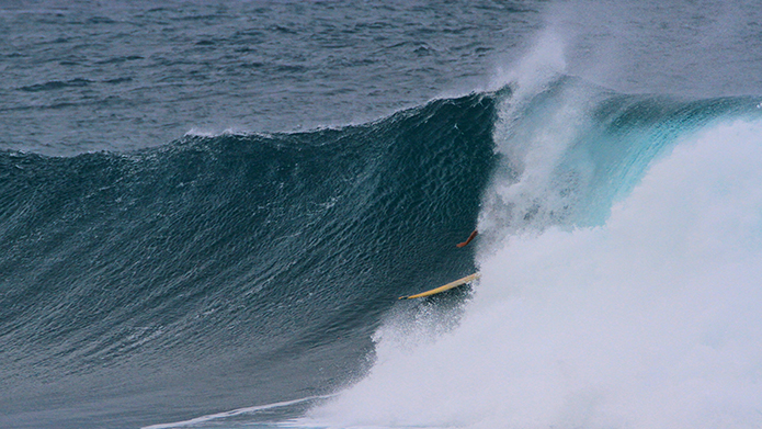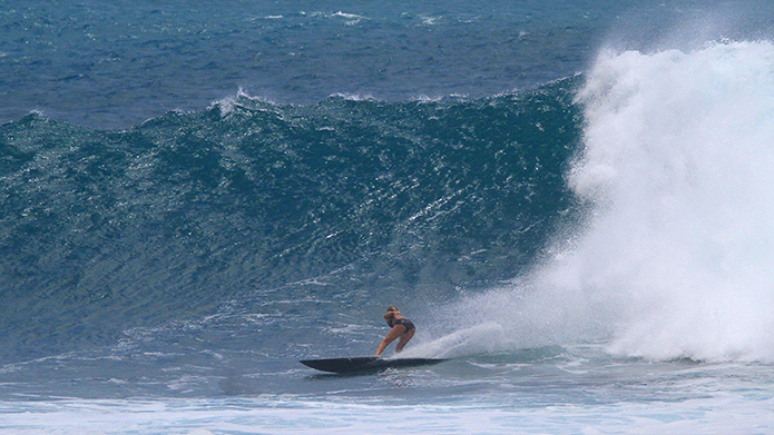 Meet big-wave surfing’s next beautiful badass. The Queen of Sunset Beach on the North Shore, Emi charges winter swells at Waimea on her 10’6” single-fin gun shaped by Lyle Carlson.
