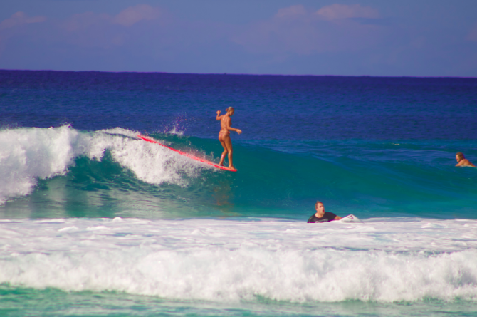 Definitely Malibu, California. It’s so fun and it’s one of my favorite places. I love how long you can ride a wave. I know it’s pretty crowded and it can get a little crazy but sometimes, if you’re in the right spot, you can score. Noosa in Australia is also really fun. It’s similar to Malibu, a really long break. And of course, Queens, my home break. And Ala Moana Bowls.