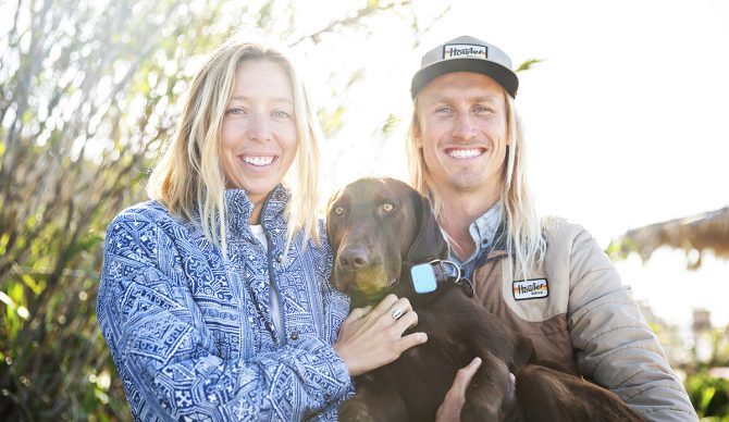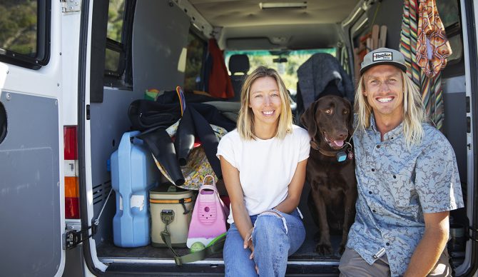 It’s 7 a.m. on a crisp spring day at Dog Patch near San Clemente when Kam and Jade Brown poke their heads out of their modified van. Koa, their chocolate lab, leaps out. Within moments, she’s got a piece of driftwood larger than her frame in her mouth. Eyes smiling. Saliva hanging to the sand.