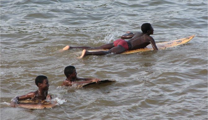 São Tomé e Príncipe is an archipelago in the Gulf of Guinea, precisely under the Equator just off-shore from Gabon and Equatorial Guinea. It comprises two beautiful islands, São Tomé and Príncipe. In the early 2000’s, when the first western surfers – Randy Rarick, Sam George, John Callahan and two Portuguese surfers, Nuno Jonet and Tiago Oliveira – arrived in São Tomé e Príncipe, they realized that there were already surfers in the main island, São Tomé. They found children having fun on the water, riding the breaking waves on wood planks, often prone, but occasionally also standing up.