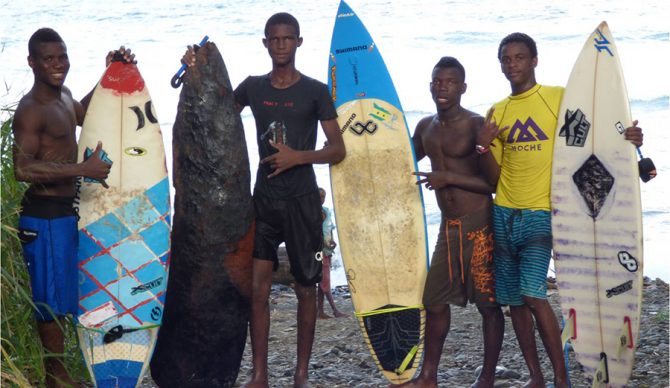 Seven years ago, three Portuguese surfers – Pedro Almeida, Paulo Pichel and Miguel Ribeiro – arrived in São Tomé to work, and brought surfboards along. They started to lend their surfboards to the local kids, kick-starting the surfing evolution that has allowed four communities of surfers to develop: Santana, Porto Alegre, Ribeira Afonso and Praia Melão, comprising at least 50 regulars surfers. They are young kids with ages ranging from 10 to 22 years old, who display an incredible amount of stoke combined with a remarkable friendliness, a common characteristic of these people.