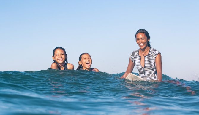 Camille takes her daughters for a surf. Photo: Carve Designs.