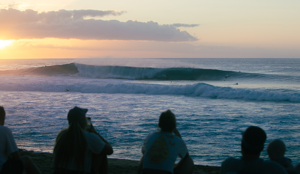 Sunset was no different. It was almost even more cinematic: there were lineups of photographers with tripods near the shady trees, broken boards carted away from the shallow water, and Jet Skis revving to grab surfers who got knocked off into the shallower inside.