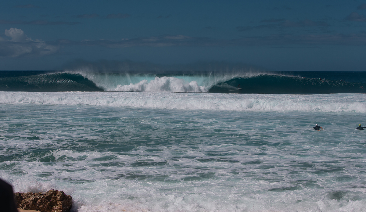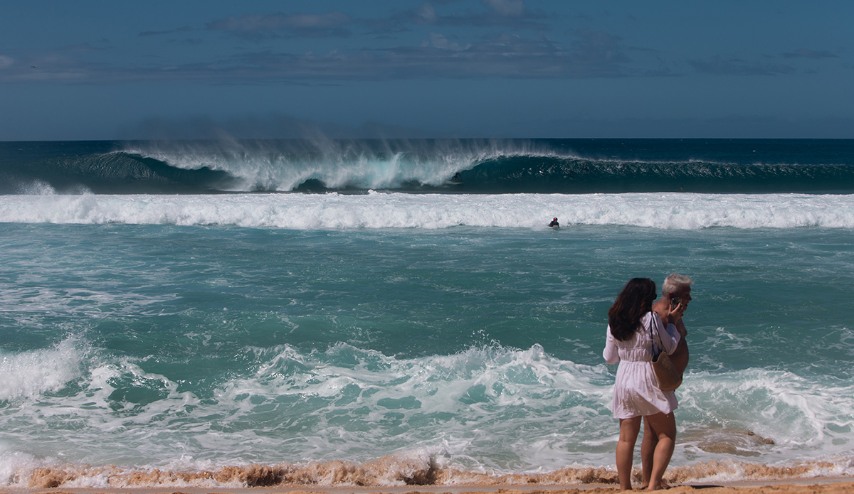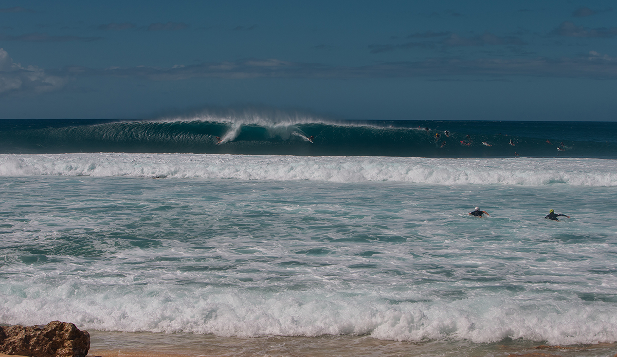 The next morning would bring a swim or surf or shoot on the beach and the waves would crash up victoriously above Shark’s Cove. The swells kept coming, one after another, and it felt like the middle of the season, maybe the prime even, with no thought of dropping waves on the horizon. Pipeline’s parking lot overflowed. Police cars from Honolulu, bright blue lights perpetually on, parked at the opening and cops watched from behind black sunglasses as throngs of kids, photographers, tourists, surfers, and lifeguards swarmed back and forth like ants to watch the scene unfold. The picnic tables were full of men in bright shirts and binoculars watching the lineup and the tuberides were as close as possible without touching sand. Two old men next to me complained about wind direction, mused that they may as well have lunch and come back out, and that tomorrow would also be big anyway.