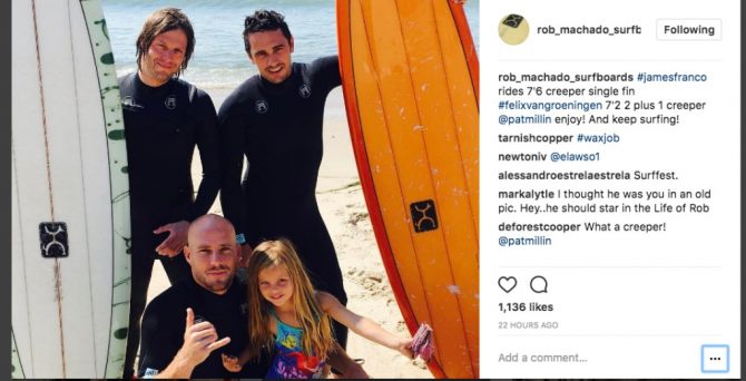 Franco recently popped up on Instagram hanging with San Diego surfer, actor, and stuntman Pat Millin, and the Belgian film director Felix van Groeningen. Millin posted on the ‘Gram last month that he and Franco saw an 8-foot great white “breach 3 times then make a casual encounter/pass by.”