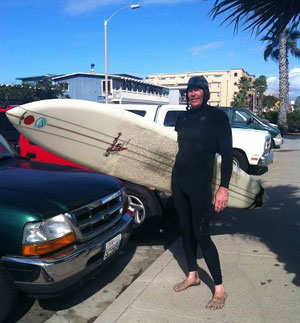 Back on the sand after beaching a good right. Beat, but very happy with a great session in excellent conditions. My legs are getting sore from the long walk through the soft sand back to the car and all the turns on fast, steep, long waves. My gun feels VERY heavy.