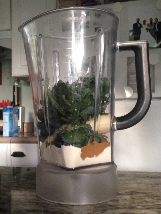 I call this my Power House Shake. Every morning I make this shake, and it always hits the spot. I usually use all organic ingredients, but every now and then one or two non-organic items slip in there.