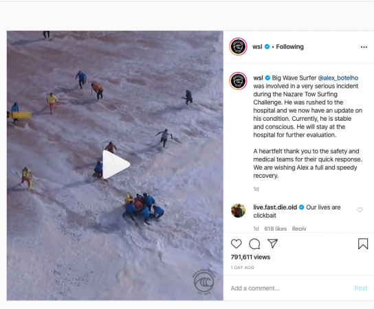 By the time the League did offer an update on their own feed, plenty of news stories from Portuguese channels had reported Botelho was conscious and recovering in the hospital. Their own statement echoed all the information that had already been made available. They can only report whatever information exists, but the radio silence during that rescue and the abrupt end to the broadcast still didn’t (doesn’t) sit right. With or without that little bit of assurance from the WSL — something I’d argue they’re responsible to provide if they choose to show big wave contests at all — I found myself glued to the computer looking for updates, not just on Botelho’s accident, but to see if the best big wave surfers in the world would make it another day. And then one Albee Layer summed it all up with a single comment on the WSL’s Instagram: