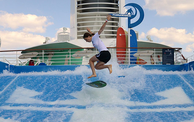 In an article published by USA Today, it was revealed that Royal Caribbean CEO Adam Goldstein had a change of heart regarding the company’s strict FlowRider safety rules after hearing from a young passenger who learned how to surf aboard one of his cruise ships and went on to become the youngest female World Pro Flowboarding Champion. Her name is Xana-Kai Nash. On his blog, Goldstein outlines the edgy maneuvers that will now be allowed on Royal Caribbean FlowRider machines, including “various types of fun tricks such as sitting, 180 degree turn, facing opposite direction, lazy boy, drop knee, drop knee 360, layback, boogie shuvit, baseball catcher, 360, skiing, show pony, rail slide, basic ollie, pop shuvit, heel side stall and the toe slide stall.” Seriously, you can’t make this stuff up.