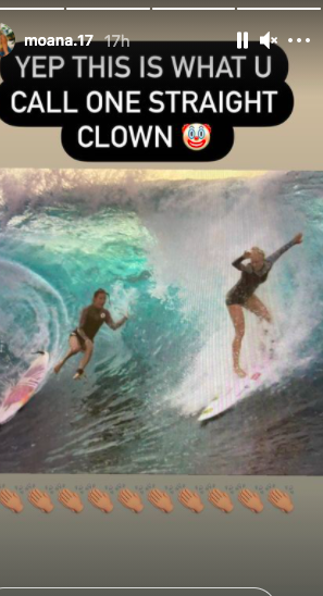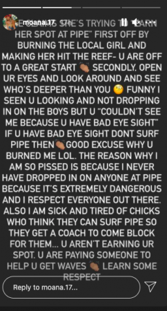 Jones took the fight to Instagram, posting the incident to her stories. Weston-Webb issued an apology. Jones’ frustration, she says, stems from pro women not earning their way into the lineup, but instead hiring coaches to block for them, which might be a legitimate beef. (See here.) Duly noted that making one’s way into the Pipe lineup is no small task, for man or woman, so props.