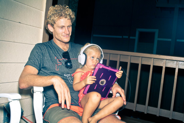 The decks and lawns overlooking Pipeline were populated with more children than drunken revelers this year. Toddlers seemed to be the only ones stumbling around and causing any mayhem. I went to a bbq at the Fox House and it was definitely a family affair. Axel Irons could be spotted relentlessly running around on the lawn. Kerrzy’s daughter charmed the guests in the kitchen with her genetically stellar smile. Freddy P’s daughter clutched her Micky Mouse doll tightly in her arms and curiously eyeballed the surfers sauntering by with plates stacked full of huli huli chicken. Bede’s daughter quickly staked out prime real estate on the porch and sat intently on her dad’s lap listening to her iPad. Her dad had placed a pair of oversized headphones on her to help drown out the DJ and shield her ears. In an eerie and ironic twist, just hours later, Bede would perforate his own eardrum in a nasty Pipe wipeout during his heat against Nat Young.