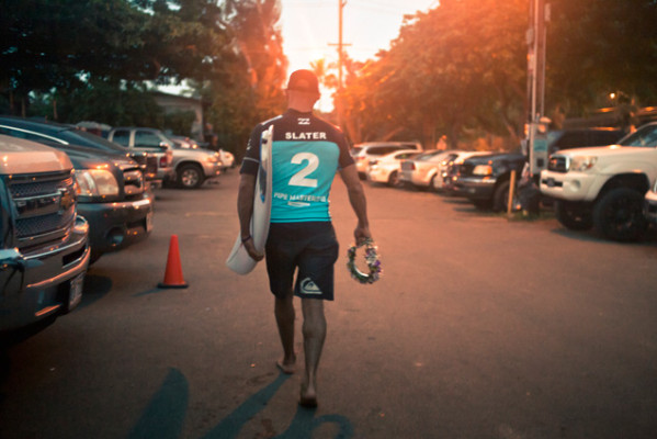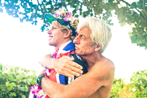 Just minutes earlier, Mark was actually one of the first people to greet Kelly at the water’s edge when he won the Pipe title. The bottle of champagne that Kelly chugged, and that was subsequently captured in countless photos, was actually handed to him by Mark. Despite this, Mark is one of the few people that had the credibility, the history and the sincere warmth of spirit to be able to toggle between the Slater and Florence camps so quickly and effortlessly after such a potentially divisive heat. He strolled up to John and gave him a heartfelt and compassionate hug. His brief embrace conveyed an untold measure of empathy and kindness. An unmistakably elated grin appeared on John’s face, but only for a brief moment.