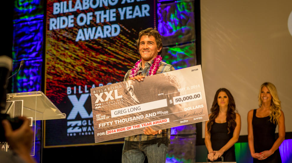 Friday night, the Billabong XXL Awards took center stage at the City National Grove of Anaheim. The event saw the world’s elite big wave riders come together to celebrate another year of massive waves, outstanding performances, and epic wipeouts. The Grove’s big screens showcased the best footage of the year from Nazare to Beharra, from Jaws to Teahupoo, and the audience hooted and hollered for their favorite big wave mad (wo)men. Koa Rothman, Grant “Twiggy” Baker, Mark Healey, Keala Kennelly, and Gautier Garanx walked away with big checks, but the night’s top honors went to San Clemente native Greg Long who took out the Ride of the Year.