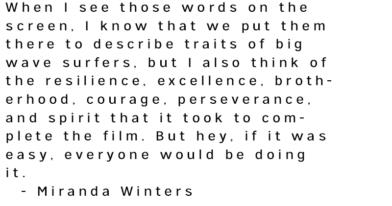Red Chargers was a challenge. Go Big is based out of LA and we thought we were going to send a small crew over to Portugal for two or three weeks. But over and over again, swells kept coming up on the horizon. It was around 60 days before everyone finally got home. Once everyone was home there were plenty of hurdles for post production. We went through multiple rounds of editors and cuts before we could press play on the final cut. When I see those words on the screen, I know that we put them there to describe traits of big wave surfers, but I also think of the resilience, excellence, brotherhood, courage, perseverance, and spirit that it took to complete the film. But hey, if it was easy, everyone would be doing it.