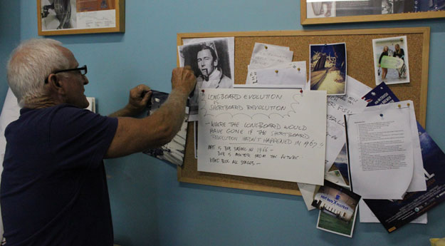Pinned front and center, by red tacks, is a large piece of card stock on which Bob’s written, “LONGBOARD EVOLUTION VS. SHORTBOARD REVOLUTION.” Photo: Butler