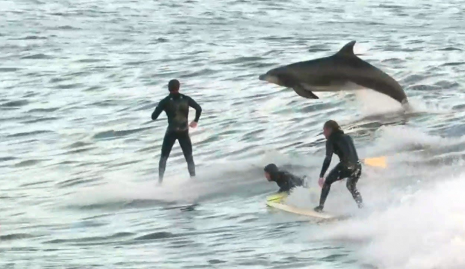 Sure, there’s more than one person on the wave. Two surfers at one point and a guy on a surf mat for good measure. But they were all sharing it with a pod of dolphins. Not just one dolphin, but a handful of them. And that’s a once-in-a-lifetime party wave that’d soften up even the saltiest of souls.