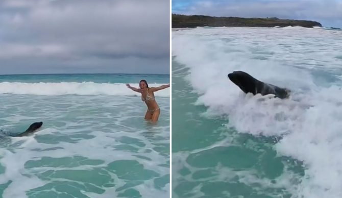 The video was posted on TikTok by a 24-year-old from Austin, Texas. She was on her honeymoon in September at Porto Chino Beach on San Cristóbal Island in the Galápagos, playing in the shallows, when the seal approached her.