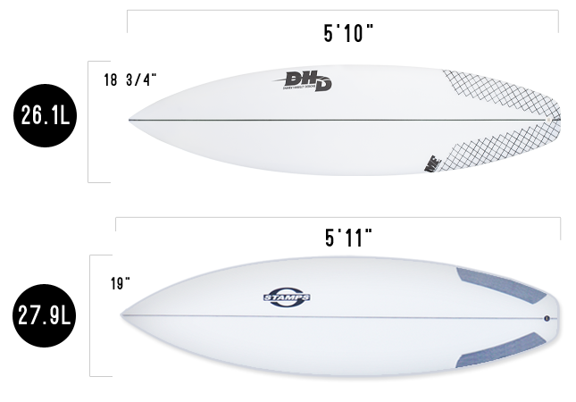 This can be seen in every surfer across all levels of ability. Mick Fanning, standing at 161 lbs and is 5’10, is going to need different equipment than the larger Brett Simpson standing at 179 lbs and is 6’1. Mick could get away with something in the 26L of volume like his 5’10 2015 MF Ducks Nuts. Simpo, on the other hand, may like to go for something around 28L like the Stamps Scarecrow.