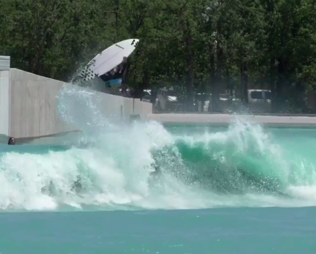Seth launches off the section pointing his nose toward the beach, er, the edge of the wave pool. That’s the first 180 degrees.
