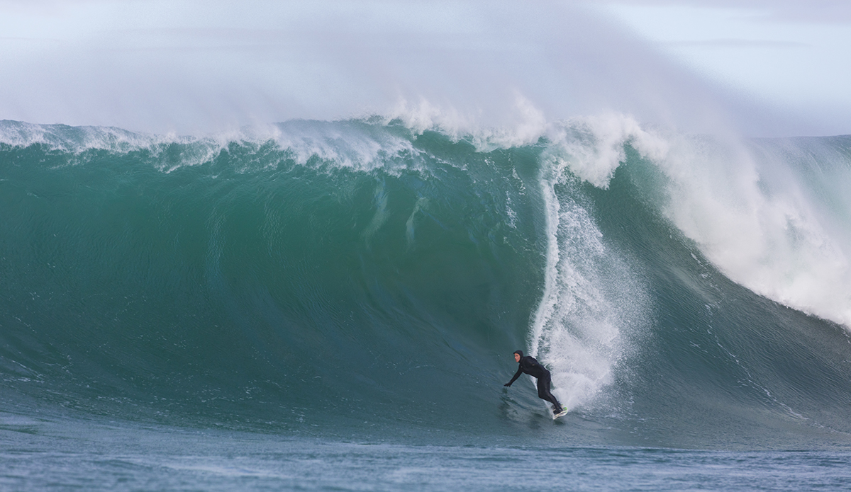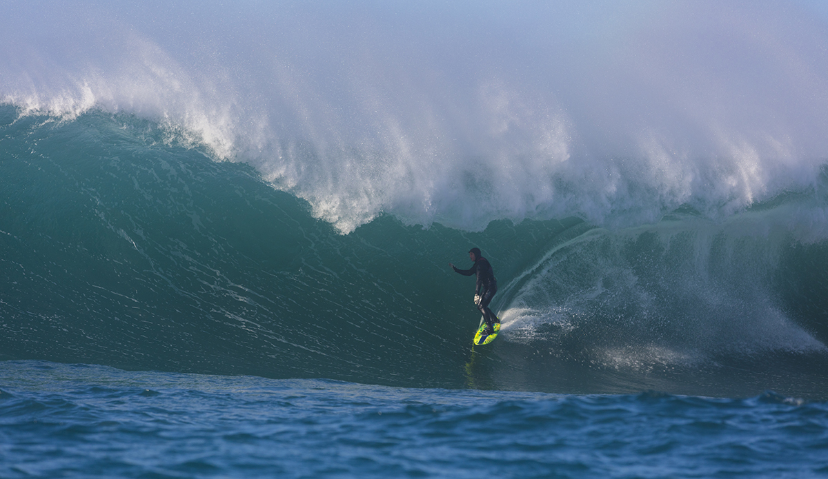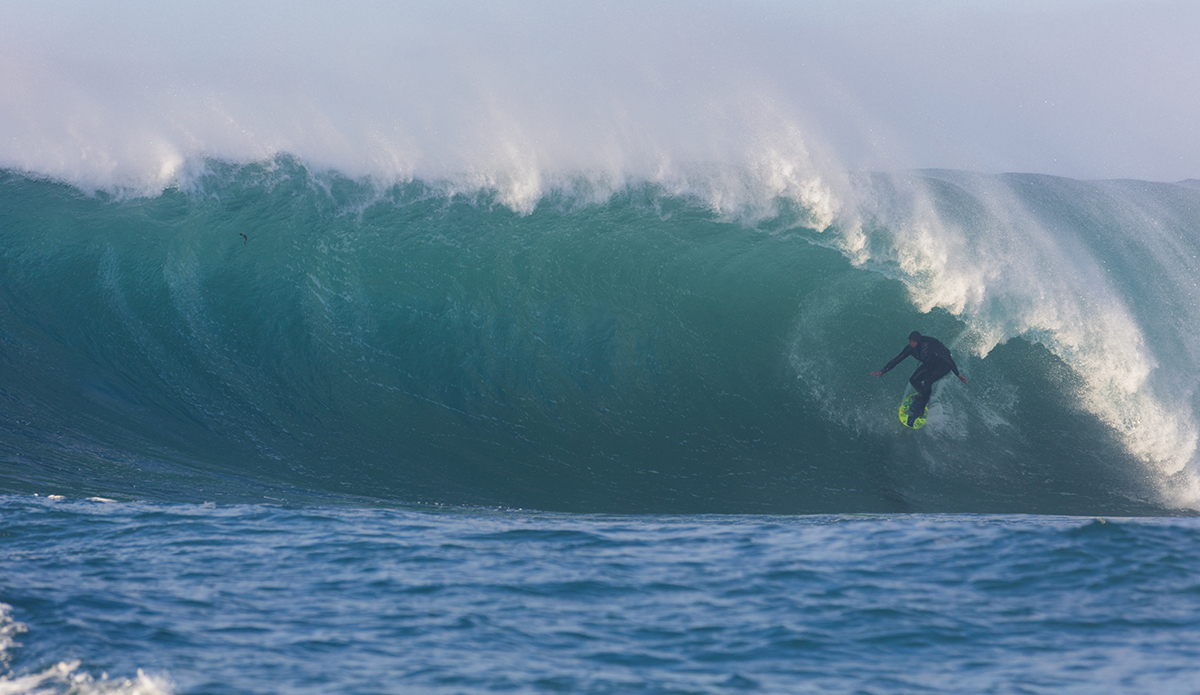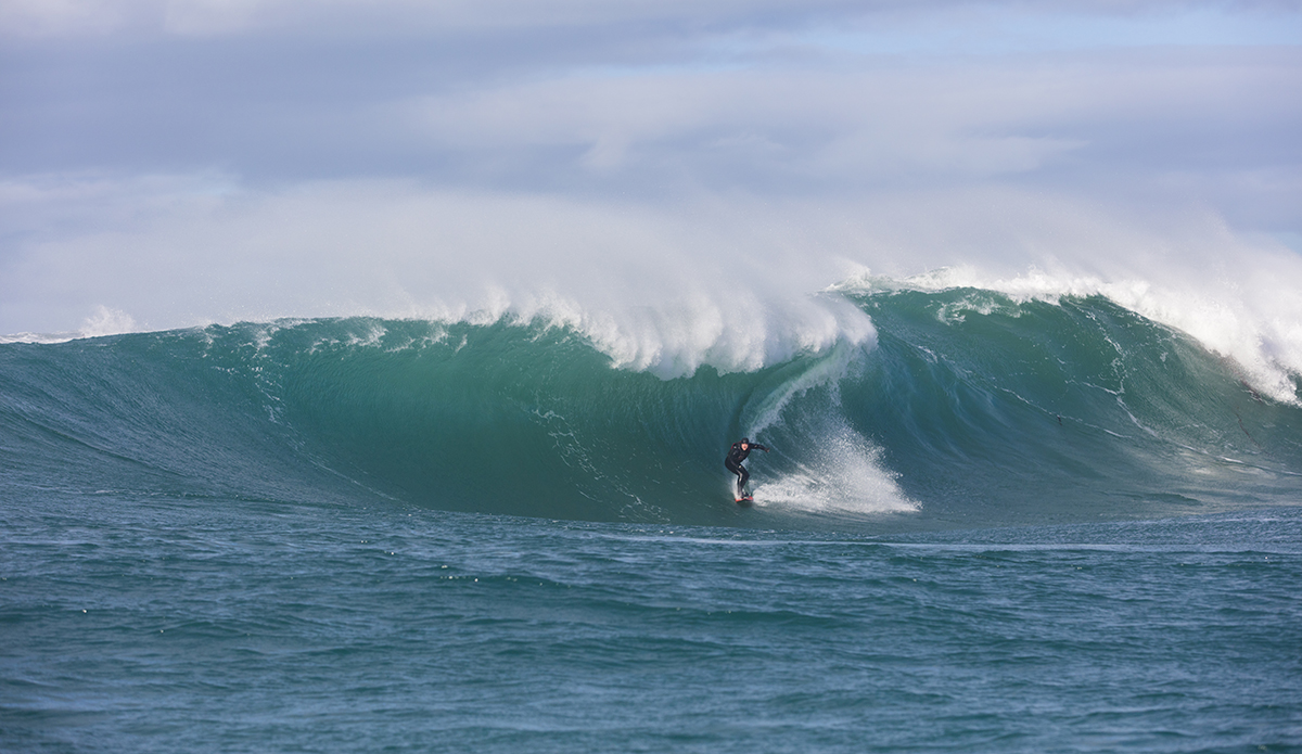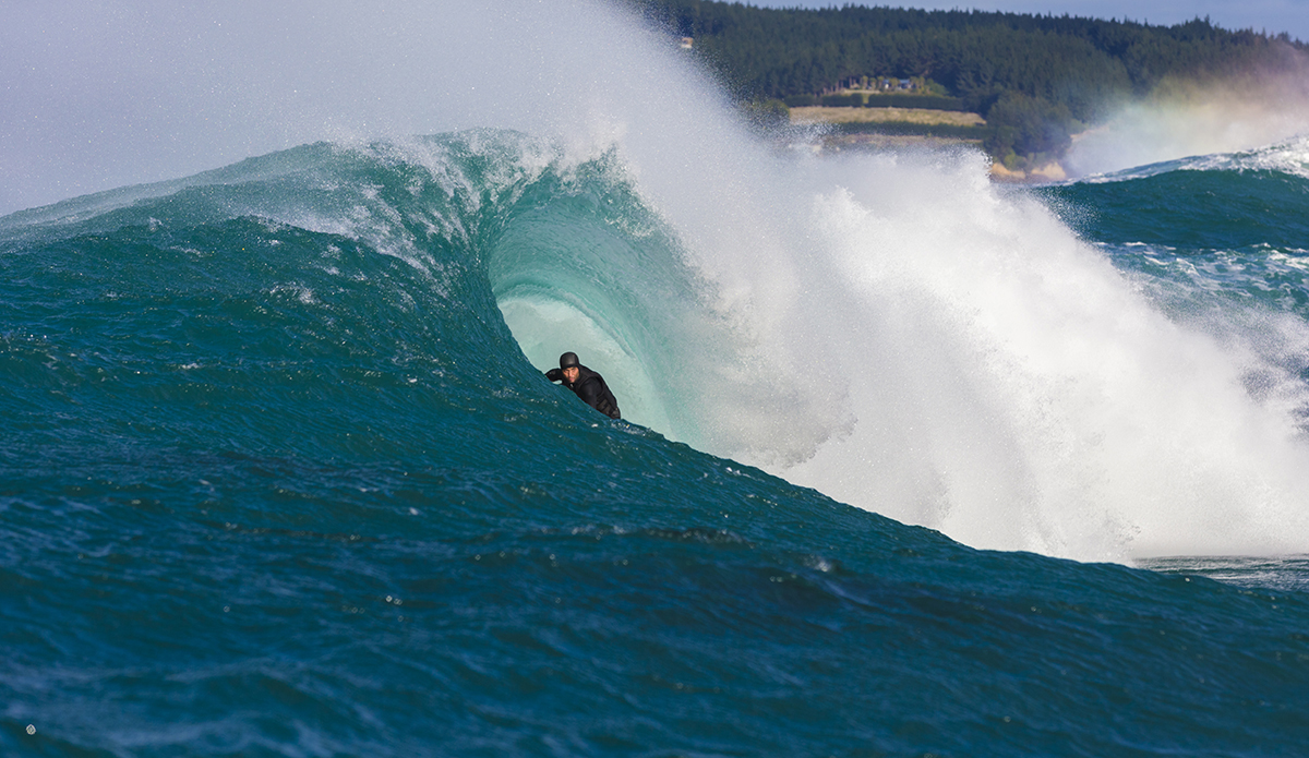 Tim Searing rides a giant wave at a remote reefbreak near Dunedin, New Zealand. Photo: Derek Morrison