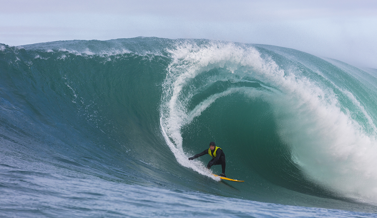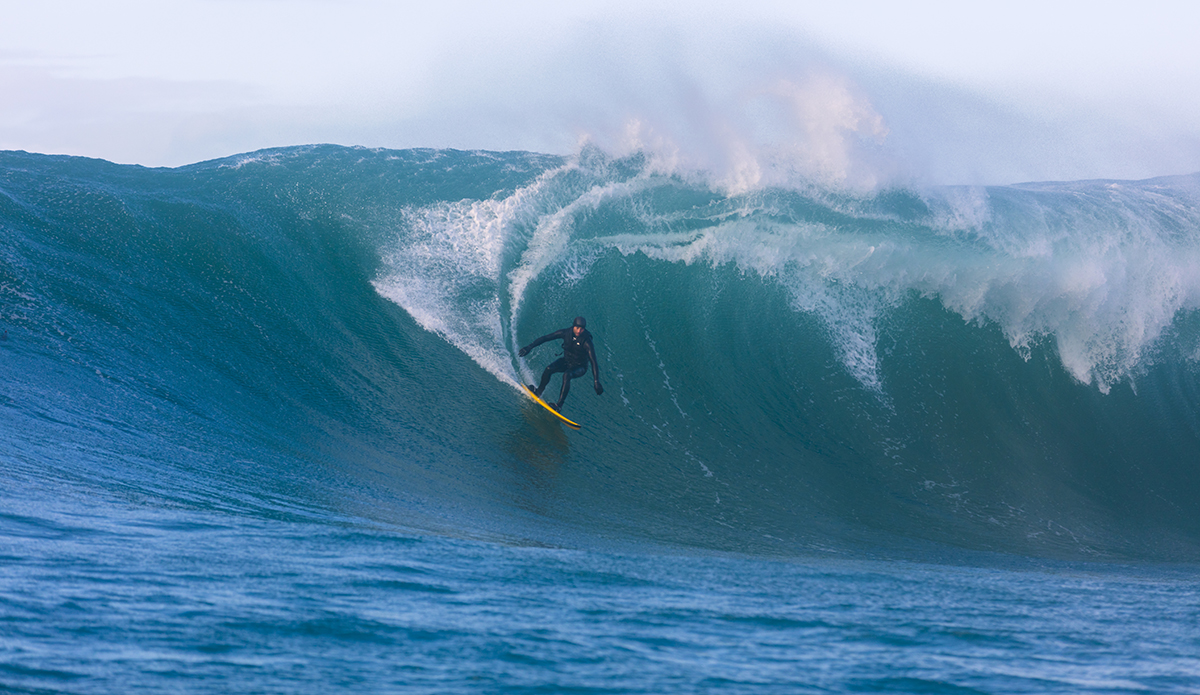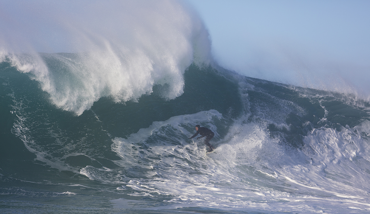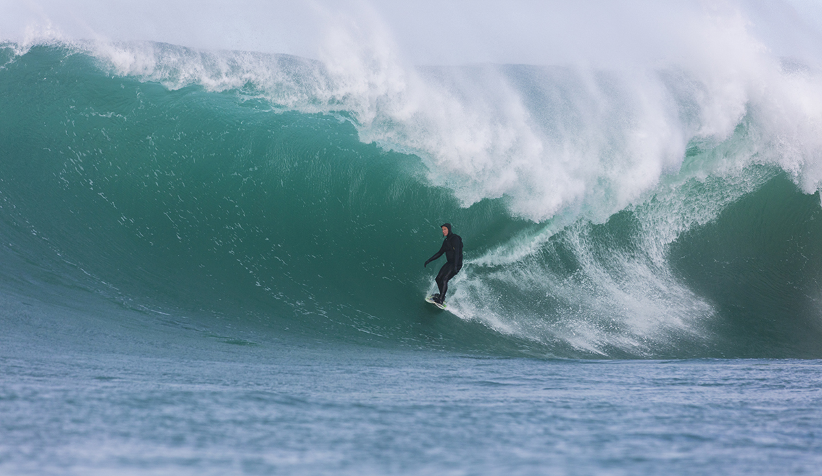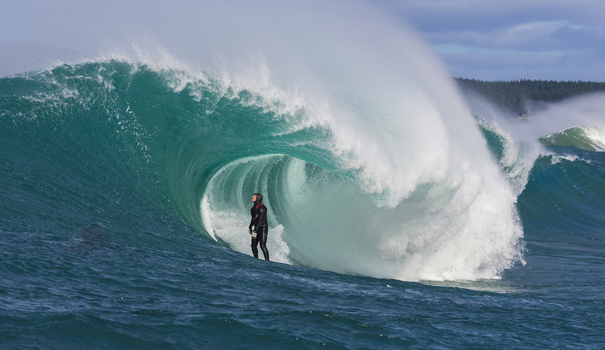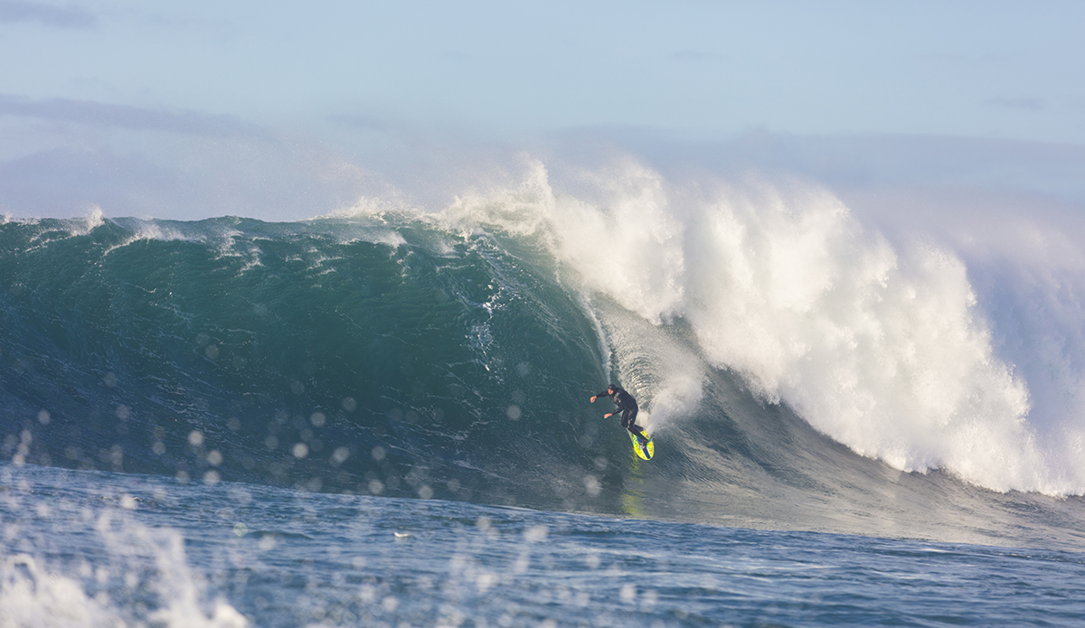 Tim Searing rides a giant wave at a remote reefbreak near Dunedin, New Zealand. Photo: Derek Morrison
