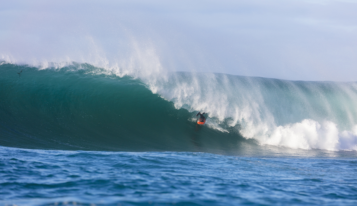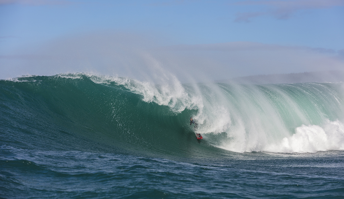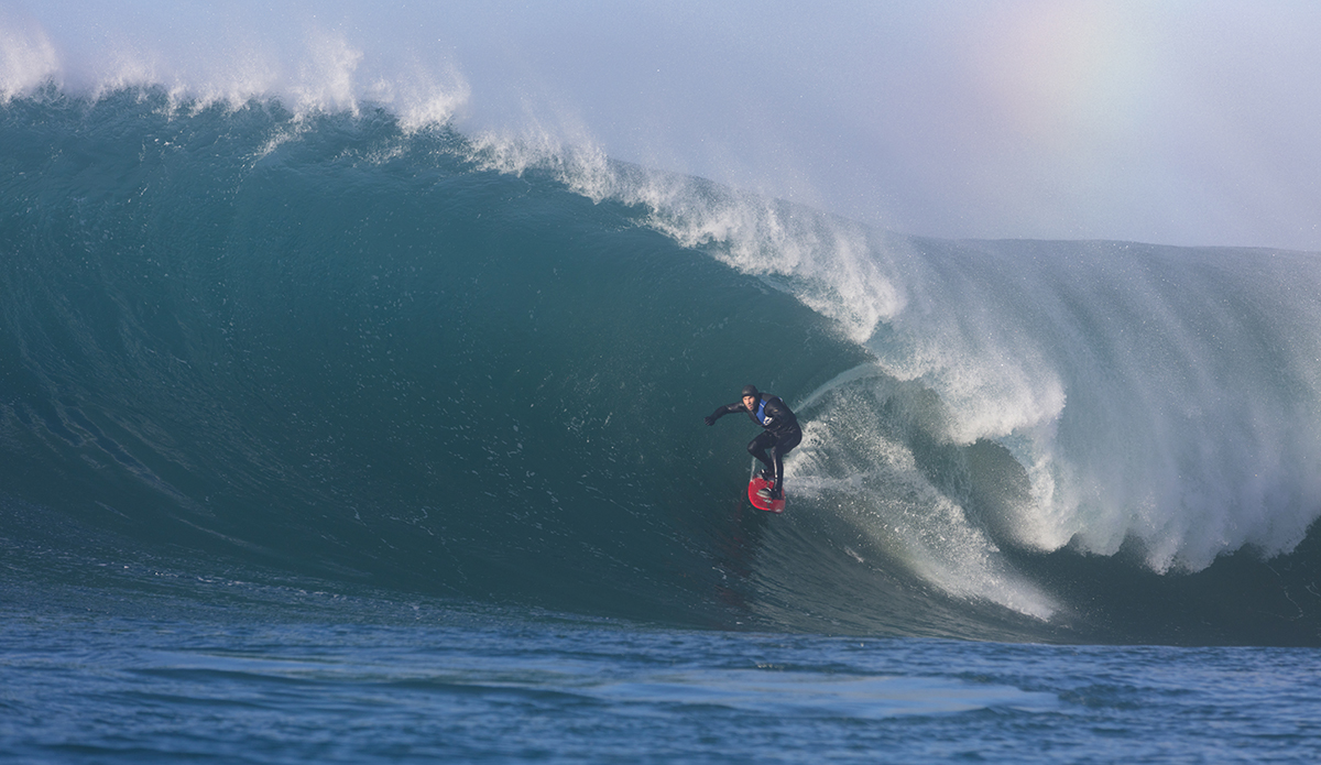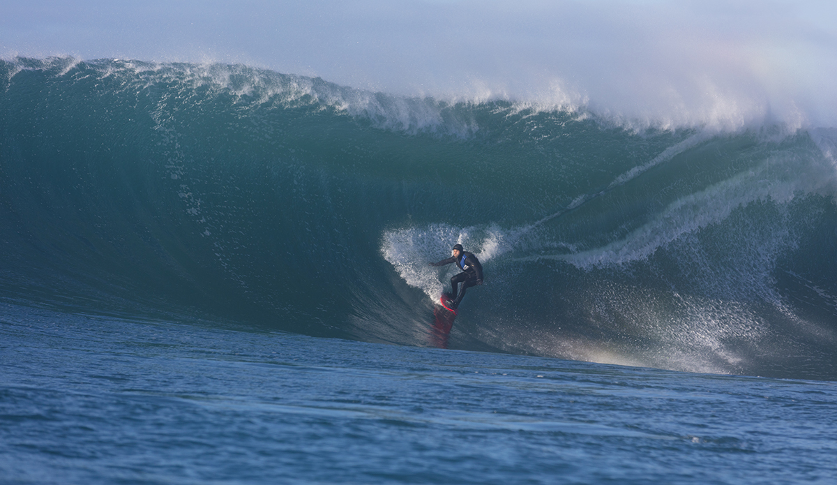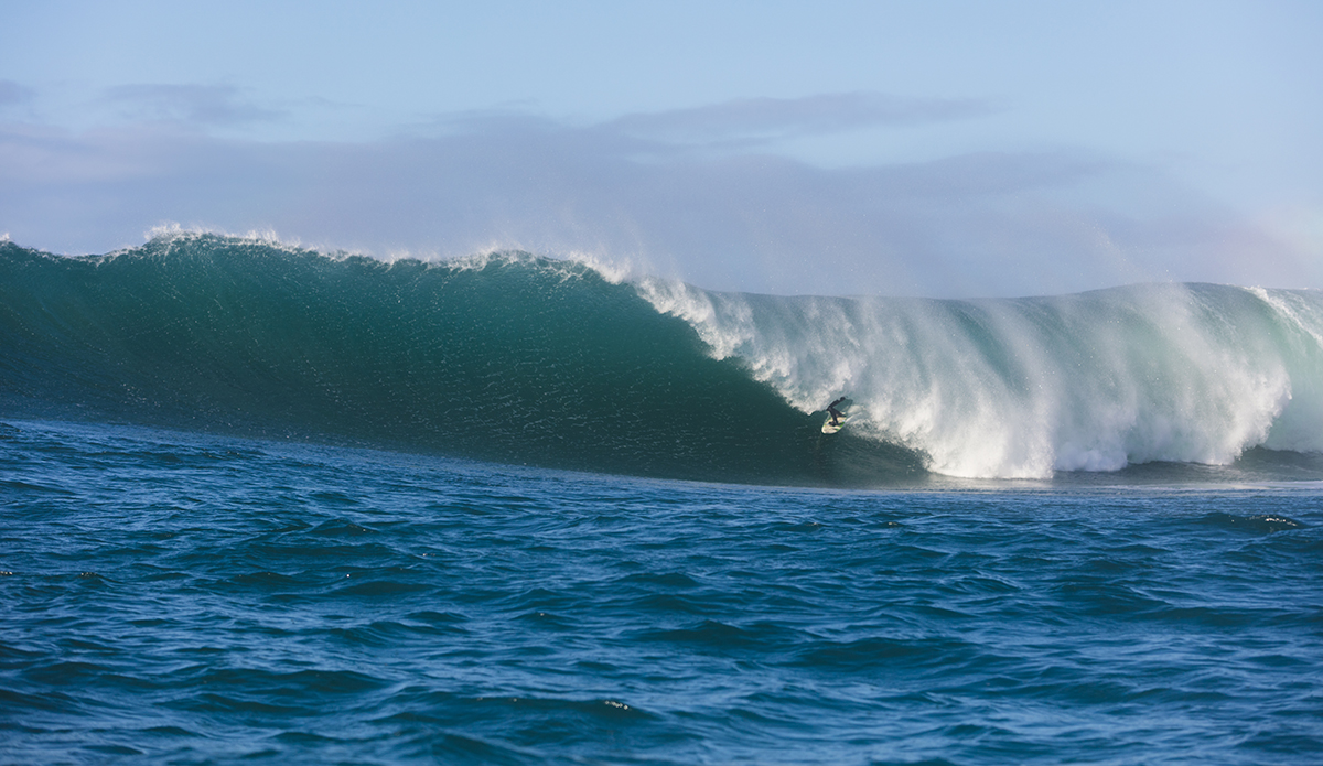 Tim Searing rides a giant wave at a remote reefbreak near Dunedin, New Zealand. Photo: Derek Morrison