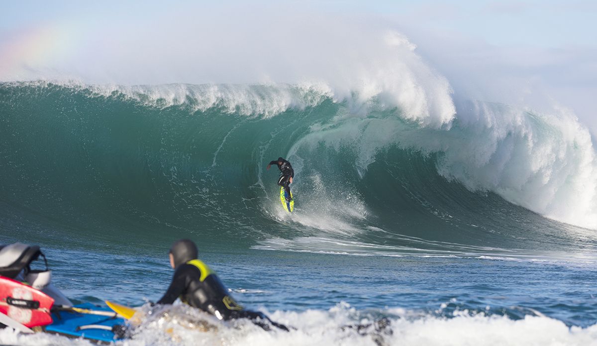 Big wave surfers tow-in at a remote reefbreak near Dunedin, New Zealand. Photo: Derek Morrison