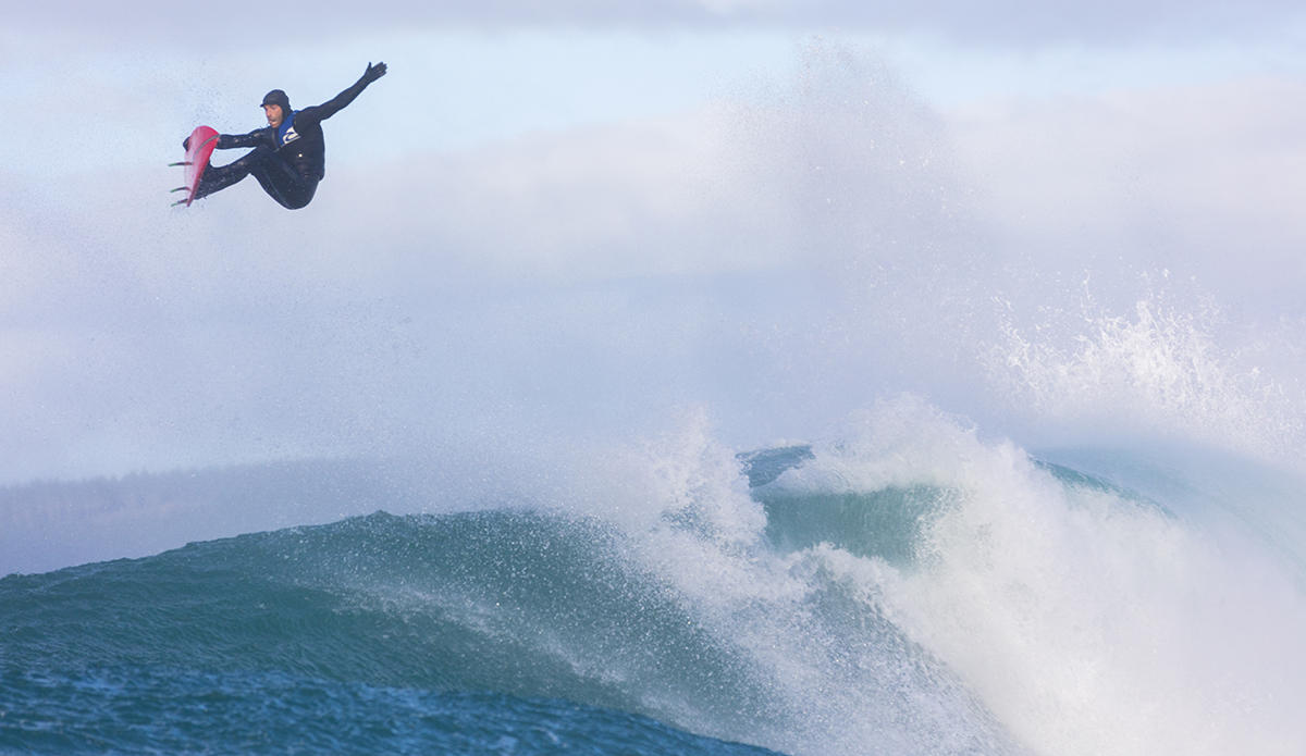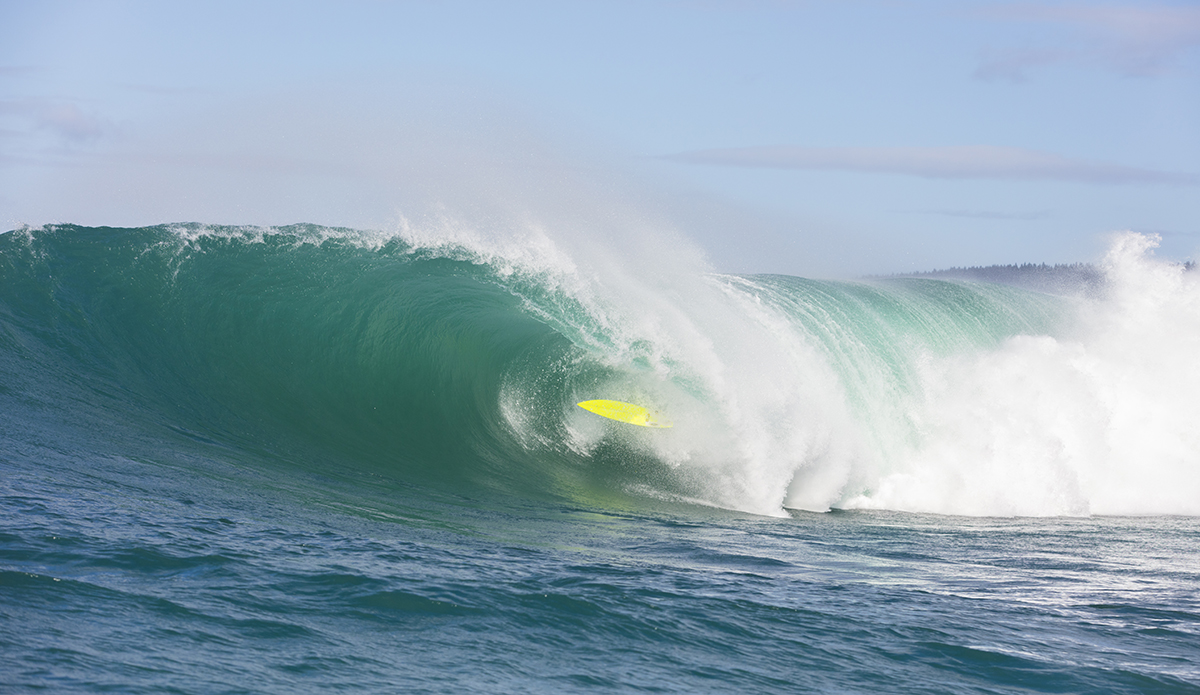 Nat Parsons rides a big wave at a remote reefbreak near Dunedin, New Zealand. Photo: Derek Morrison