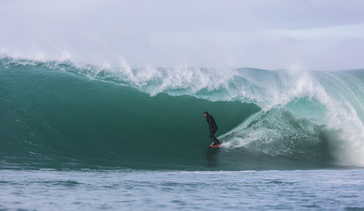 Davy Wooffindin rides a large barrel at a remote reefbreak near Dunedin, New Zealand. Photo: Derek Morrison