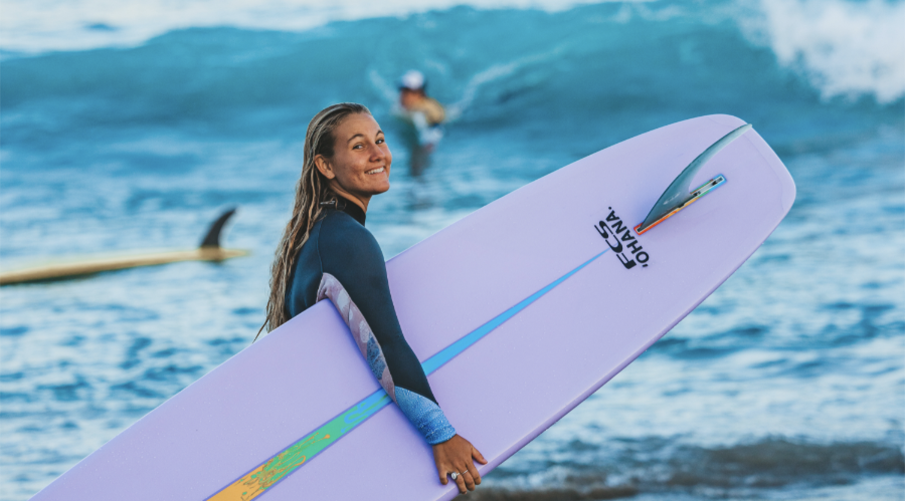 Culhane regularly trains, travels, and competes against her Waikiki crew. A lot of people assume there are rivalries between them but Culhane says that’s not the case. During contests, the Oahu surfers post up under an umbrella on the beach, cheering each other on and encouraging one another between heats. Although they all want to win, once the horn blows, Culhane says, they’re all friends again. She’s happy when she sees Hawaii on the podium, as are her friends.