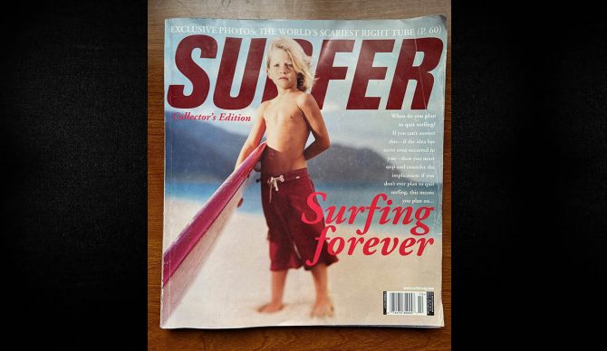 Recently pulled from my archive is an annual “Big Issue” of SURFER magazine, published during my tenure as editor in October, 2001. The outsized ‘cover blurb’ I came up with stated its theme. “When do you plan to quit surfing?” it read. “If you can’t answer this — if the idea has never even occurred to you — then you must stop and consider the implication: if you don’t ever plan to quit surfing, this means you plan on…Surfing Forever.” And to really punch this point home, the accompanying cover photo, shot by the legendary Art Brewer, was an arresting portrait of six-year-old Nathan Florence.