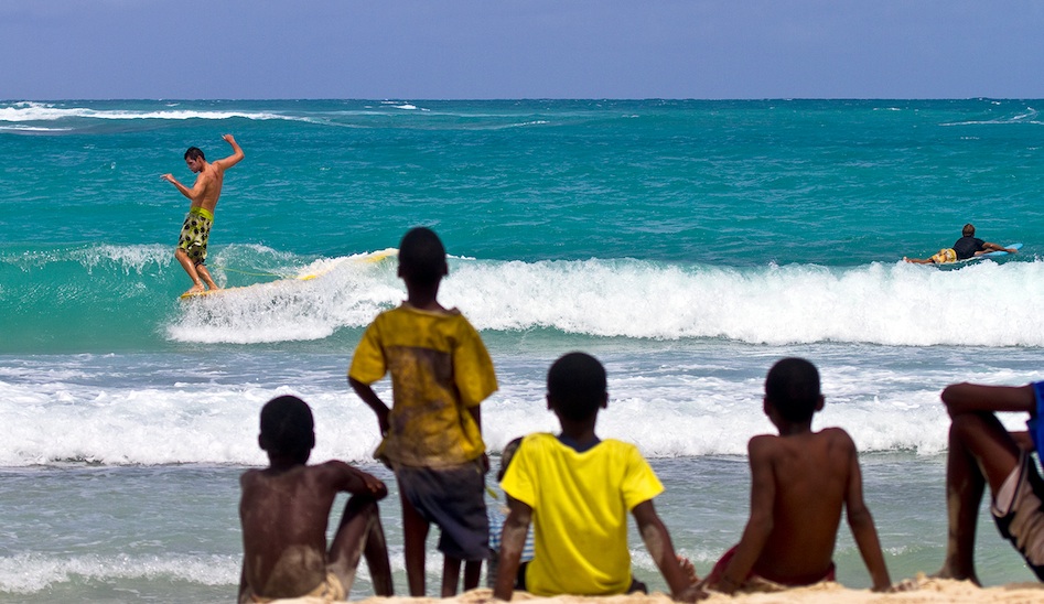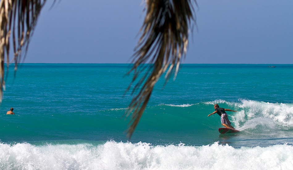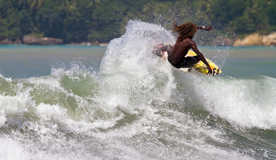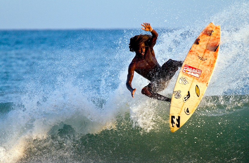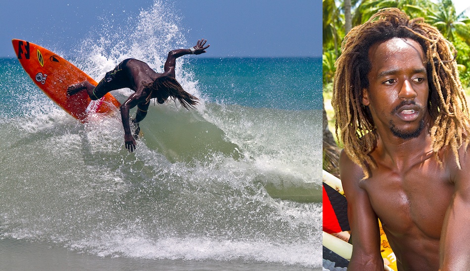 Icah Wilmot of Jamaica is one of the Caribbean's top surfers. Here he gets his fins out at a Haitian river mouth. Photo: John Seaton Callahan.