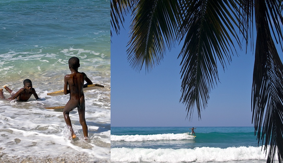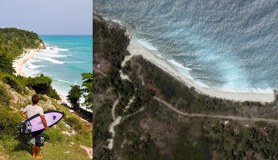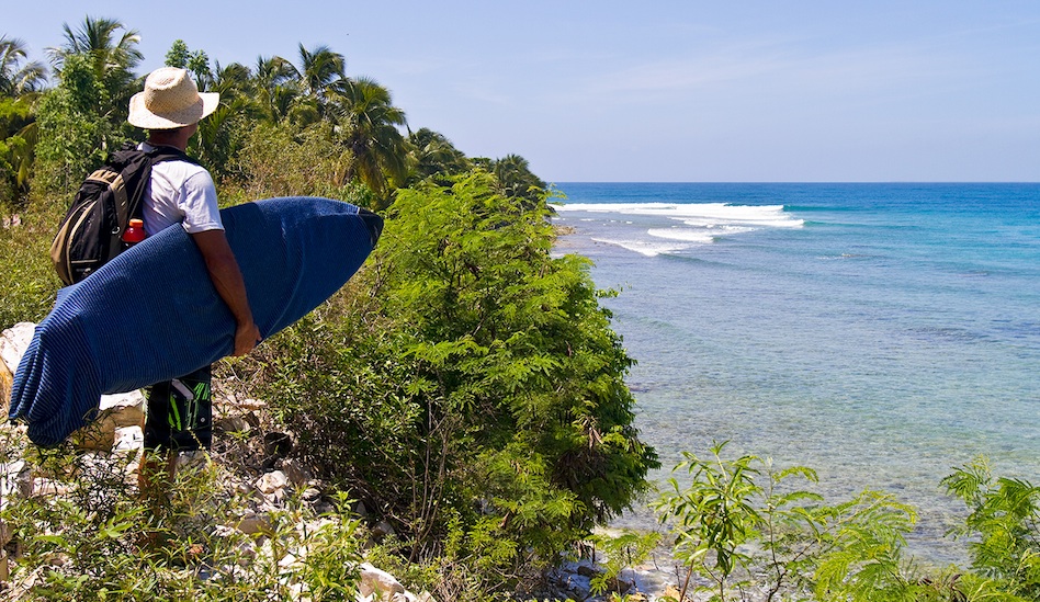 Sometimes, those Google Earth hunches pay off. After several hours of brutal driving over a terrible road west of Jacmel, Emi Cataldi surveys a new Caribbean lineup. Photo: John Seaton Callahan.