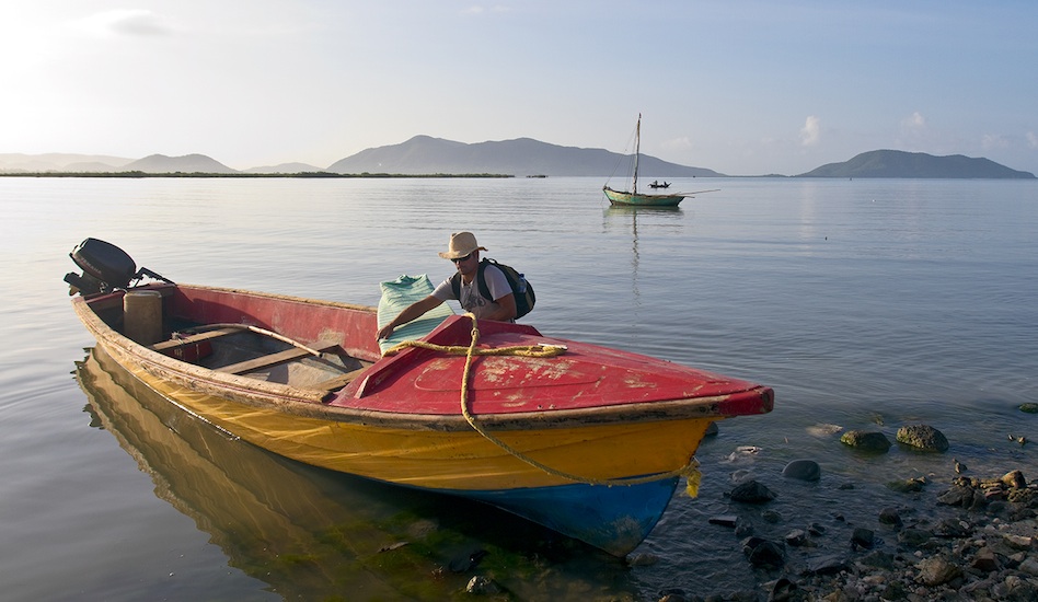 Early morning calm in Aquin as Emiliano Cataldi loads boards for a boat trip to distant Caribbean reefs. Photo: John Seaton Callahan.