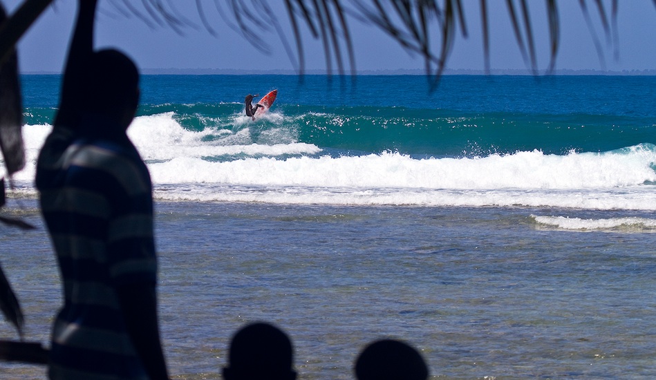 Icah Wilmot hits the lip as a crowd of villagers gather on the beach, most of whom have never seen surfing before. Photo: John Seaton Callahan.