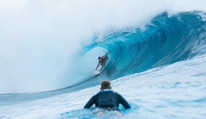 Over in Portugal on the same day, just before entering the water in the Final of the QS Pro Santa Cruz, Marco Mignot and Gatien Delahaye were filmed side-by-side, in the same position. Such was their concentration, I could have sworn both levitated into the lineup, rather than paddled.