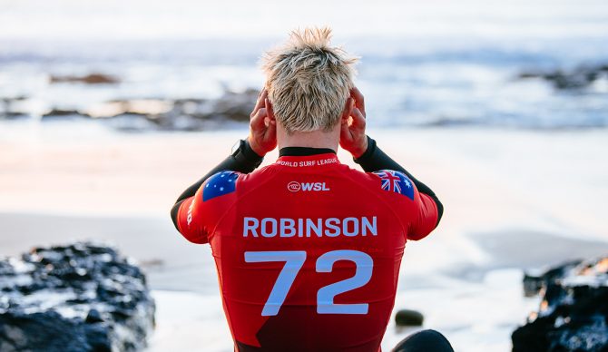 Robinson, psyching down before his heat at J-Bay. Photo: Beatriz Ryder//World Surf League